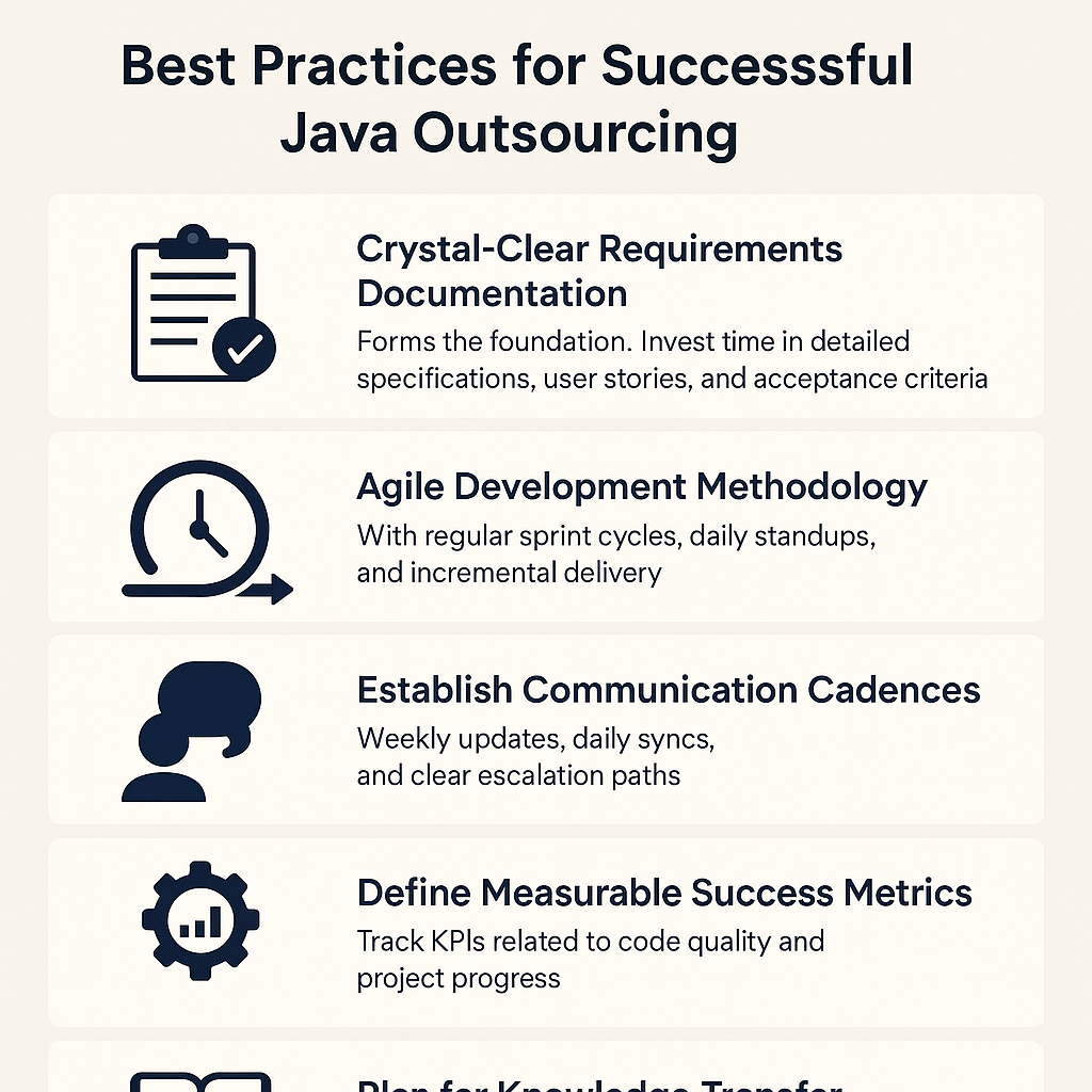 Plan for Knowledge Transfer from the beginning. Even with ongoing relationships, ensure your outsourced java development team documents architecture decisions, maintains clear code comments, and creates runbooks that enable long-term maintainability.